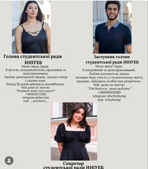 Student self-government bodies independently plan and implement the preparation of various educational, scientific, cultural and social events aimed at the development of students' professional, leadership and communicative competences. They participate in decision-making related to the educational, social and cultural life of the Institute. The activities of student self-government are aimed at the development of active citizenship, leadership qualities and responsibility of students, as well as at improving the quality of the educational process and forming a united Academic community. |