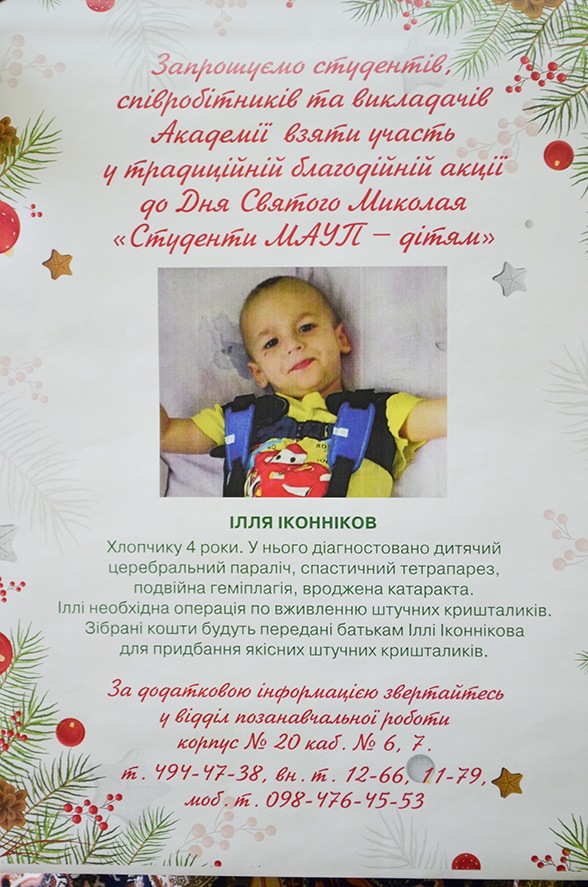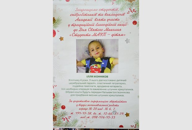 On the eve of St. Nicholas Day, the traditional charity event "IAPM Students - for Children" was held at the Presidential University of the Academy. This year, funds were raised by four-year-old Ilya Ikonnikov. The baby’s diagnoses occupy a whole page in his medical record. Among them is congenital cataract. The boy needs an operation to implant artificial lenses. Academy management, teachers, staff, students decided to help Ilya's family raise funds for the purchase of high-quality lenses.