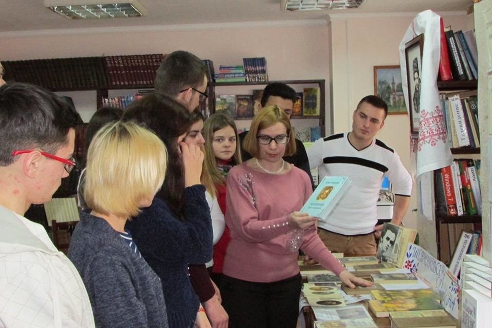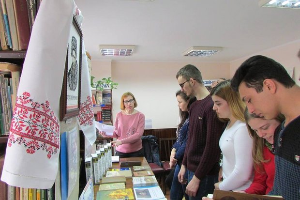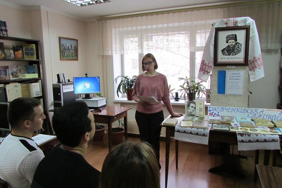 The head of the branch S. Kosiychuk conducted a review of the book exhibition "The Kobzarevoye Word," which presents Taras Shevchenko's works of art, literary criticism and journalistic literature on his life and work, and offered students a set of articles for creative work and teaching, and recommended An annotated list of literature from the library branch library.