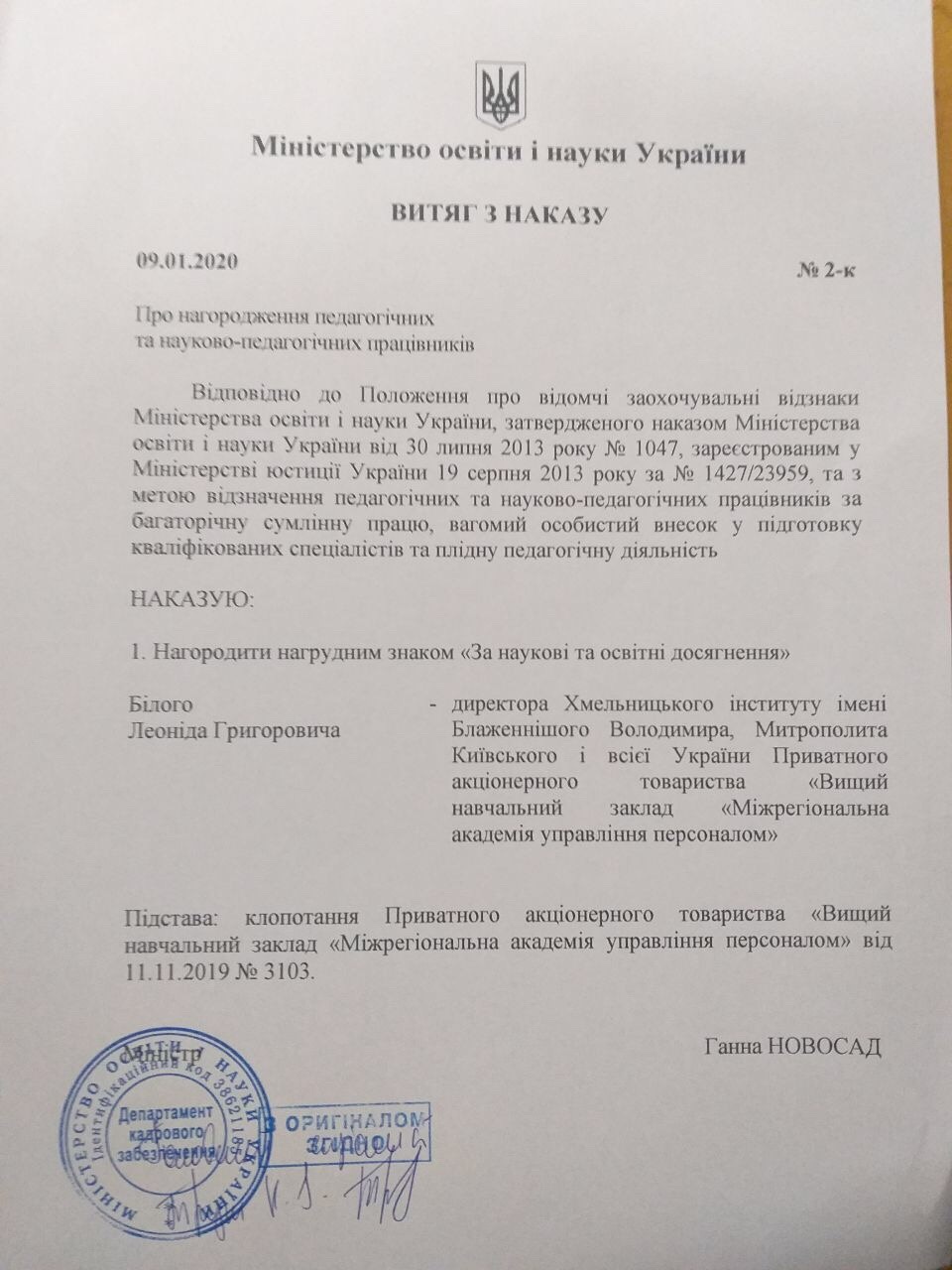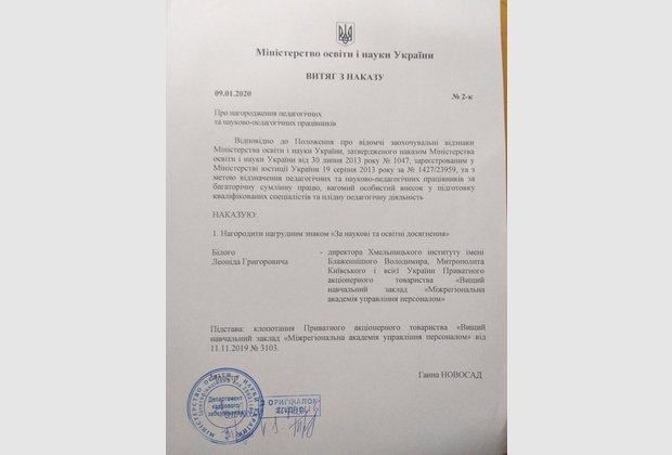 The director of the Khmelnytsky Institute was awarded the honorary distinction of the Ministry of Education and Science of Ukraine