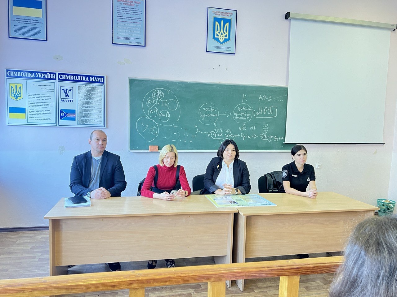 Specialists from the regional office of the Commissioner in the Khmelnytskyi region, Oksana Sheyhets and Olga Oseredchuk, together with the head of the human rights compliance sector of the Khmelnytskyi District Police Department, Police Major Lyudmila Berestovskaya, held an event for law students at the Khmelnytskyi Institute of the MAUP, during which they told young people about the activities of the Ukrainian Parliament Commissioner for Human Rights and the specifics of human rights compliance in the activities of law enforcement agencies.