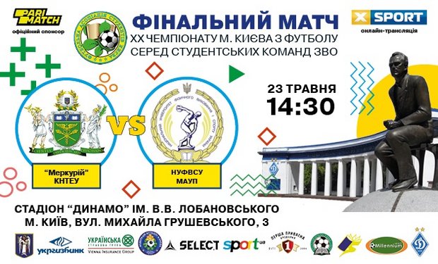 We invite all fans of student football to the culmination of the whole season - the final match and rewarding of the winners of the 20th Kyiv Football Championship among the student teams in 2019 between the Mercury team from the Kyiv National University of Trade and Economics and the national team of the National University of Physical Education and Sports of Ukraine and the Interregional Academy of Personnel Management. The game will be held on Thursday, May 23, at the legendary Valeriy Lobanovsky Dynamo Stadium at the address. Mykhailo Hrushevsky, 3.