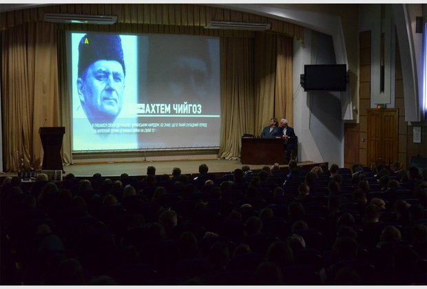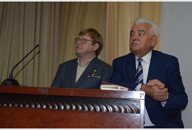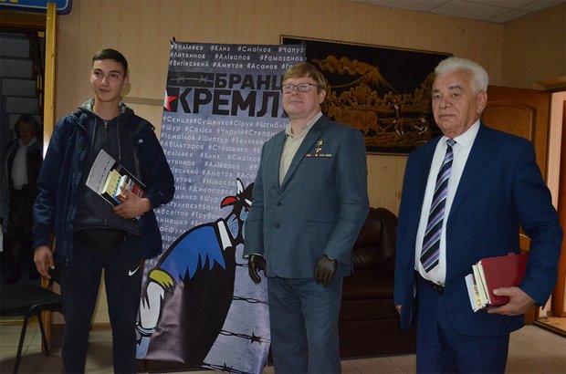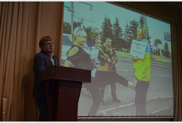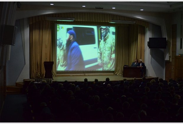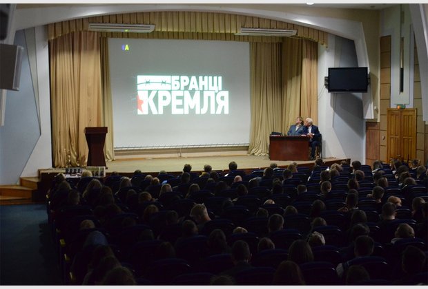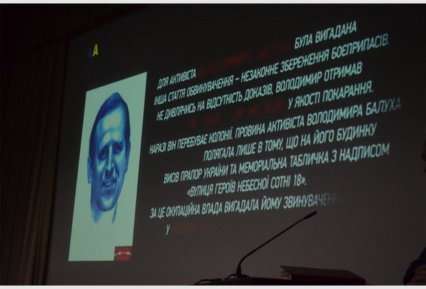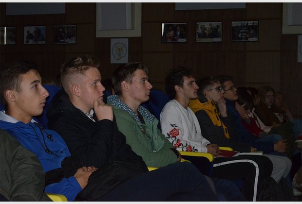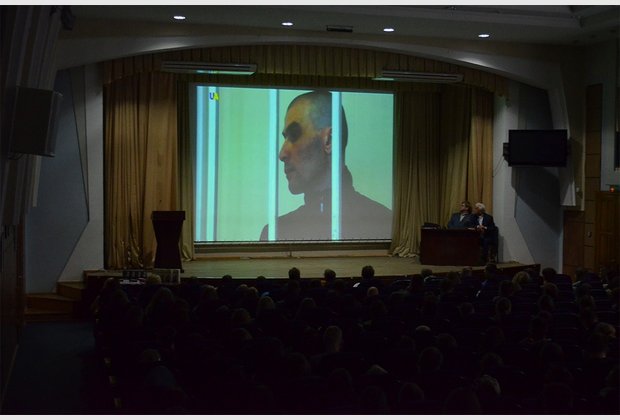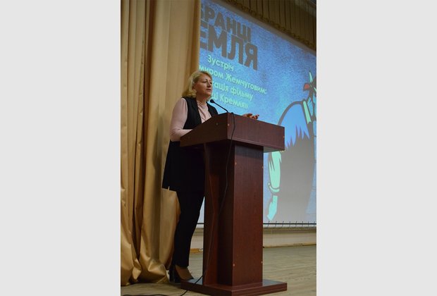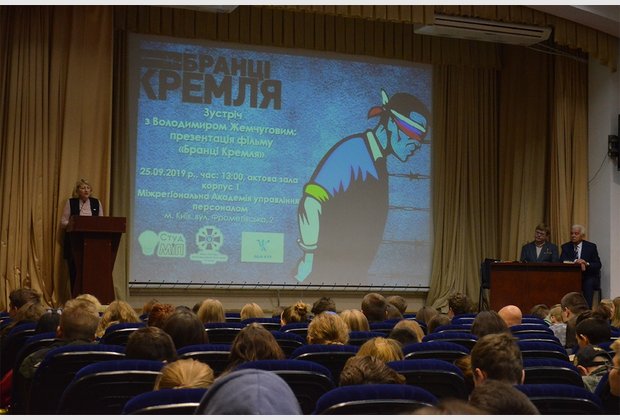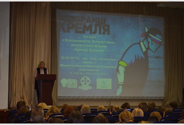 rector of the Academy Mykola Kurko made his introductory speech. He told the audience about the purpose of the meeting and turned the floor over to the project coordinator Olena Zhemchugova. She told about the history of the project, which, from the presentation of the film, has become a format for meeting students with the Hero of Ukraine. Watching the movie "Kremlin Defenders" was complemented by Olena's speech. She said that even after the hostages were released on September 7, 2019, another 80 political prisoners which are Ukrainian citizens remain the Kremlin defenders.