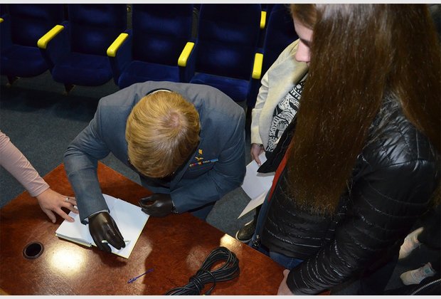 After the performance of the Hero of Ukraine, students communicated with Volodymyr in an "open mic" format having taken the opportunity to hear about the Russian-Ukrainian conflict from the mouth of a direct participant. At the end of the meeting, Volodymyr Zhemchugov presented to the Academy's library and the participants a book about the Kremlin's most famous prisoners, the history of Ukraine and the individuals who created it.
