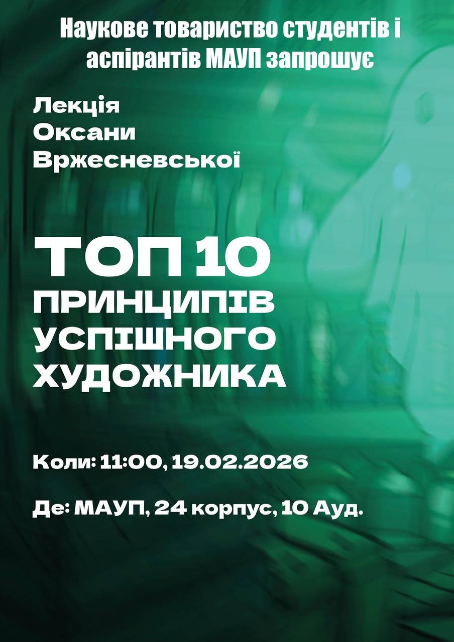 The Scientific Society of Students and Postgraduates of the Interregional Academy of Personnel Management invites students, postgraduates, and all interested parties to a scientific and practical lecture by artist-illustrator Oksana Vrzesnevska.