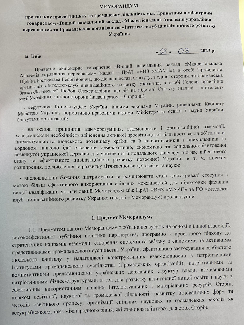 A Memorandum on joint educational and public activities was signed between the IAPM and the NGO "Intellect Club of Civilizational Development of Ukraine", the initiator of the creation of which is the scientific and pedagogical staff of the Department of Personnel Management and Labor Economics of the Educational and Scientific Institute of Management, Economics and Business.
