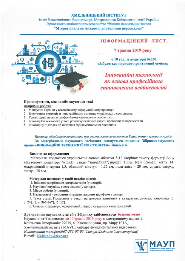 On May 7, 2019, at 10:00 in the conference hall of the Khmelnitsky Institute, a scientific and practical seminar on "Innovative Technologies as the Basis for Professional Development of the Personality" was held. Organizer: Department of Basic Training.