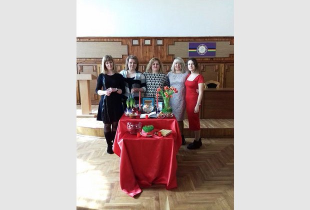 In the center of the hall there is a composition, which personified the Novruz holiday. On the red tablecloth there were green sprouted wheat grains, flowers, candles, water, nuts, eggs and money. Each element of the composition of ancient rites has its own essential importance. So sprouted wheat grains, called "seed" on a plate, tied with a ribbon, signify the awakening of nature from winter. The combination of water and grains of wheat, as well as flowers in vases symbolize fertility. Smoke from candles scares off "evil spirits." As in Ukraine on Easter, and in Muslim countries on the Novruz holiday, eggs are usually painted and tested for strength. And money, it is clear that they are a symbol of wealth in the new year!