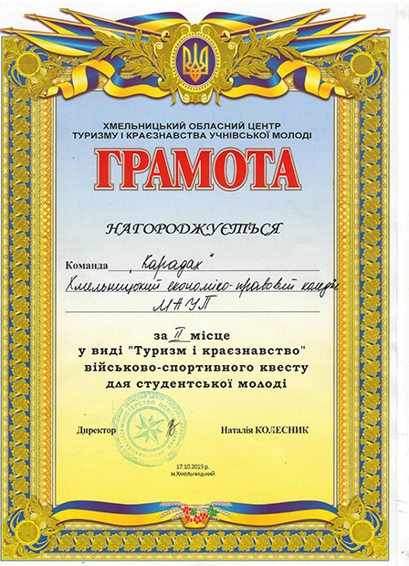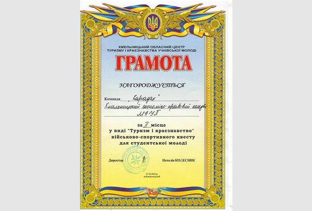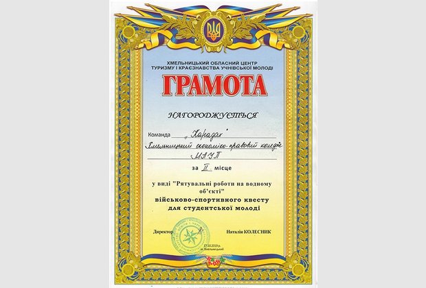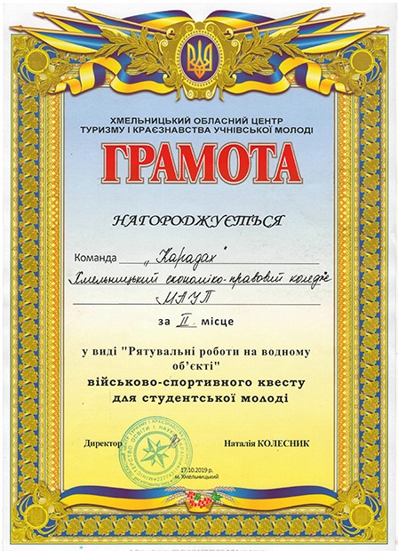 After the competition the team was awarded certificates. The Karadakh team of the Khmelnytsky Institute of IAUP and Khmelnytsky Economic and Law College took the second place in the Rescue Works at the Water Object and the second place in the Tourism and Local Studies.