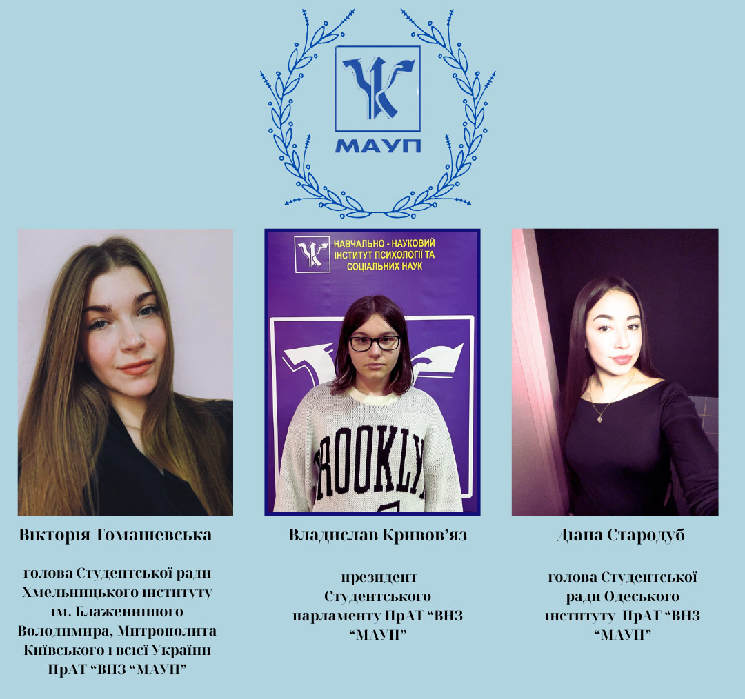 According to the order of the Minister of Education and Science of Ukraine dated January 17, 2025 No. 78, the President of the Student Parliament of the Interregional Academy of Personnel Management - Vladislav Kryvovyaz, as well as the heads of the student self-government of the Odessa Institute of the IAPM - Diana Starodub and the Khmelnytsky Institute named after His Beatitude Volodymyr, Metropolitan of Kyiv and All Ukraine - Victoria Tomashevska, became members of the Council on Cooperation with Student Self-Government Bodies of Higher Education Institutions under the Ministry of Education and Science of Ukraine.