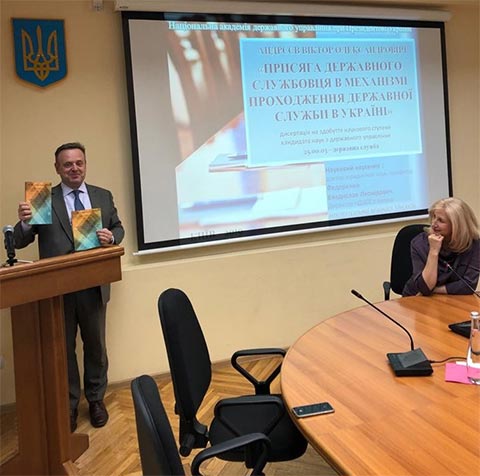 On September 24, 2019, at the National Academy of Public Administration under the President of Ukraine, the thesis was defended on the subject “Oath of a Civil Servant in the Mechanism of Passage of the Civil Service in Ukraine”, presented for the degree of Candidate of Sciences in Public Administration, specialty 25.00.03 – Civil Service.