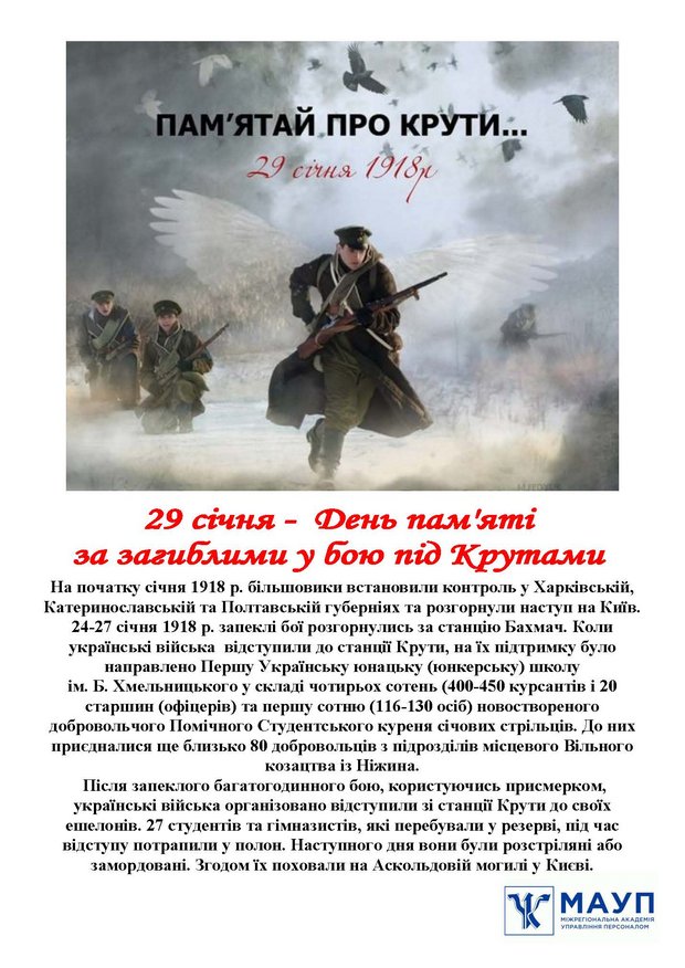 The feat of Ukrainian youths under Kruty, who with their blood sprinkled holy land in the struggle for the will of Ukraine, will forever remain in history as a symbol of national honor...