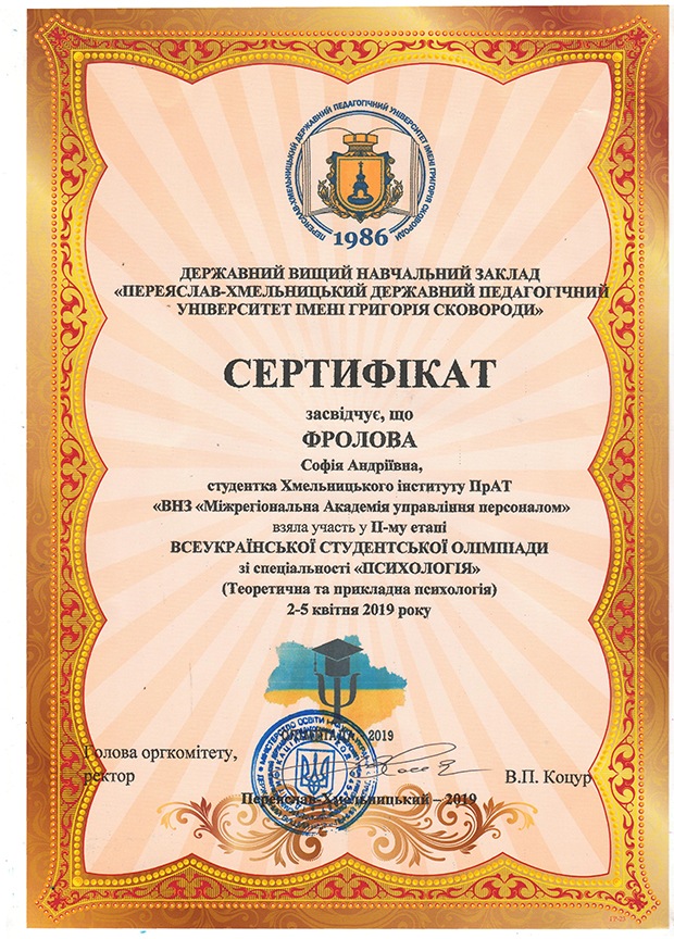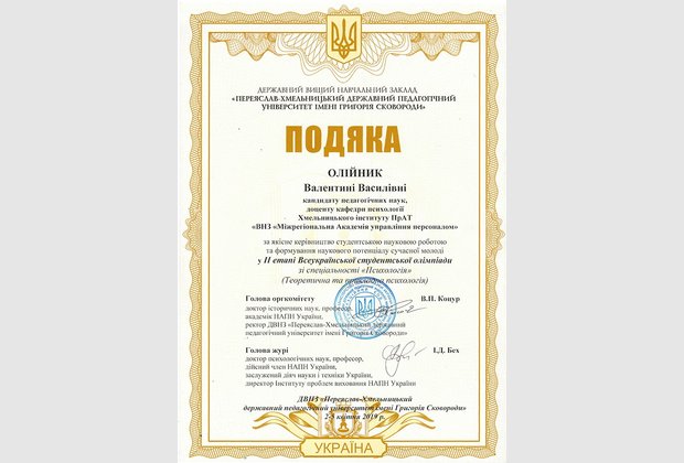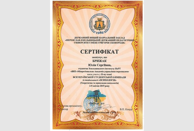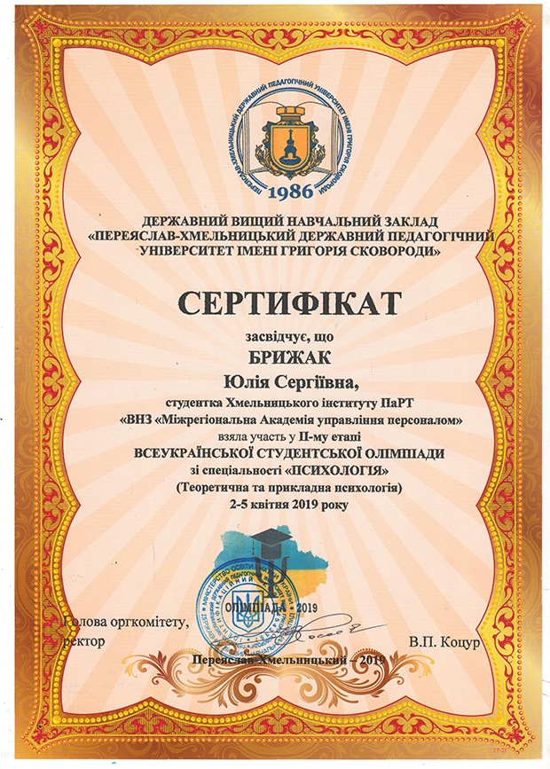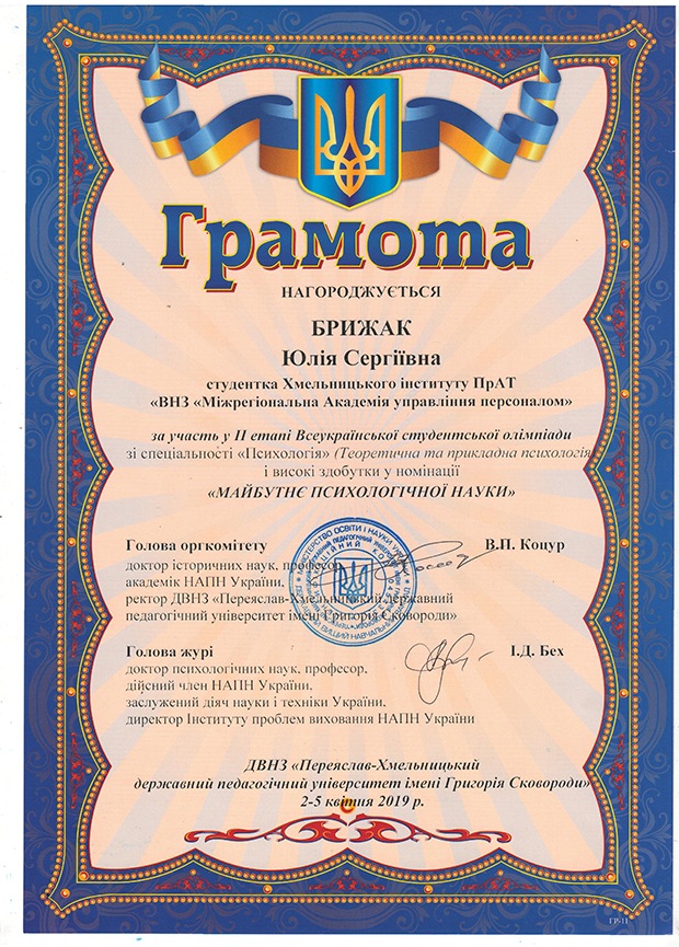 The Institute was represented by students Bryzhak Julia and Frolova Sofia, who spoke at the Olympiad under the direction of Head of the Department of Psychology Oleynik Valentyna Vasylivna.