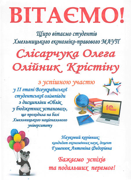 May 20-22, students of Khmelnytsky Economics and Law College Oleh Slisarchuk and Christina Oliynyk under the direction of the scientific advisor of the candidate of economic sciences, associate professor Antonina Fedorіvna Gumenyuk participated in the II stage of the All-Ukrainian student olympiad on discipline "Accounting in budgetary institutions" held at Khmelnytsky National University.