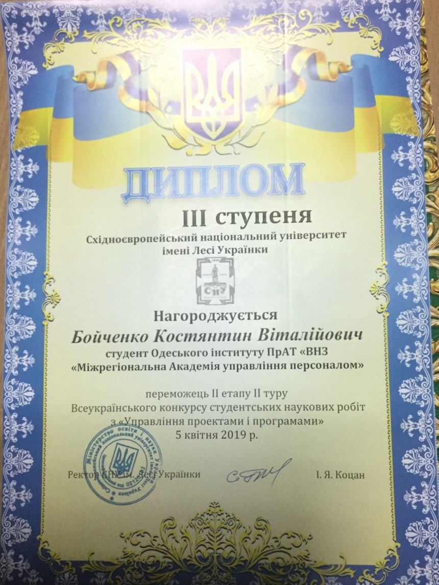 Master of specialty "Management" of IAPM Konstantin Boychenko received the Diploma of the winner III degree in the 2nd stage of the 2nd round of the All-Ukrainian contest of student research papers with the presentation of the study "IT project management in the gaming industry", prepared under the scientific guidance of the candidate of technical sciences, Associate Professor Sergei Kramsky, delivered an address at the Lesya Ukrainka Eastern European National University in Lutsk on April 5. Konstantin plans to continue research on this topic.