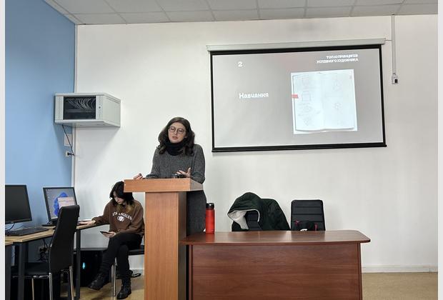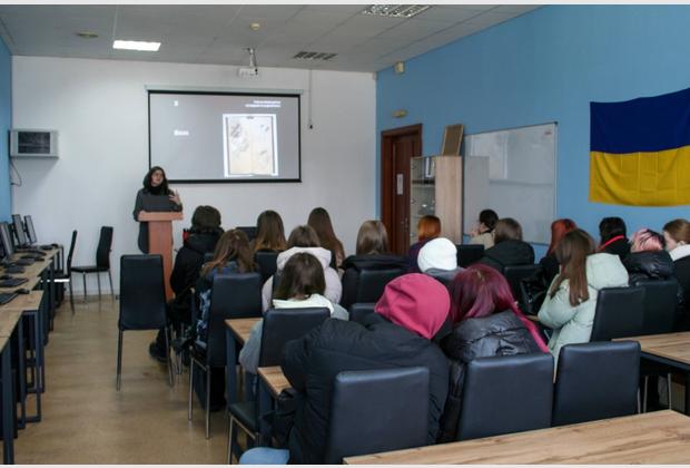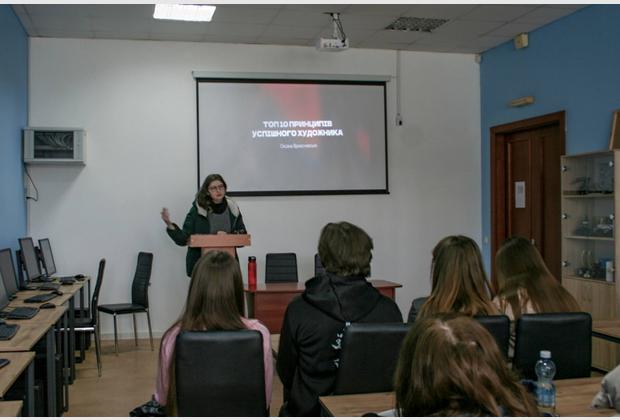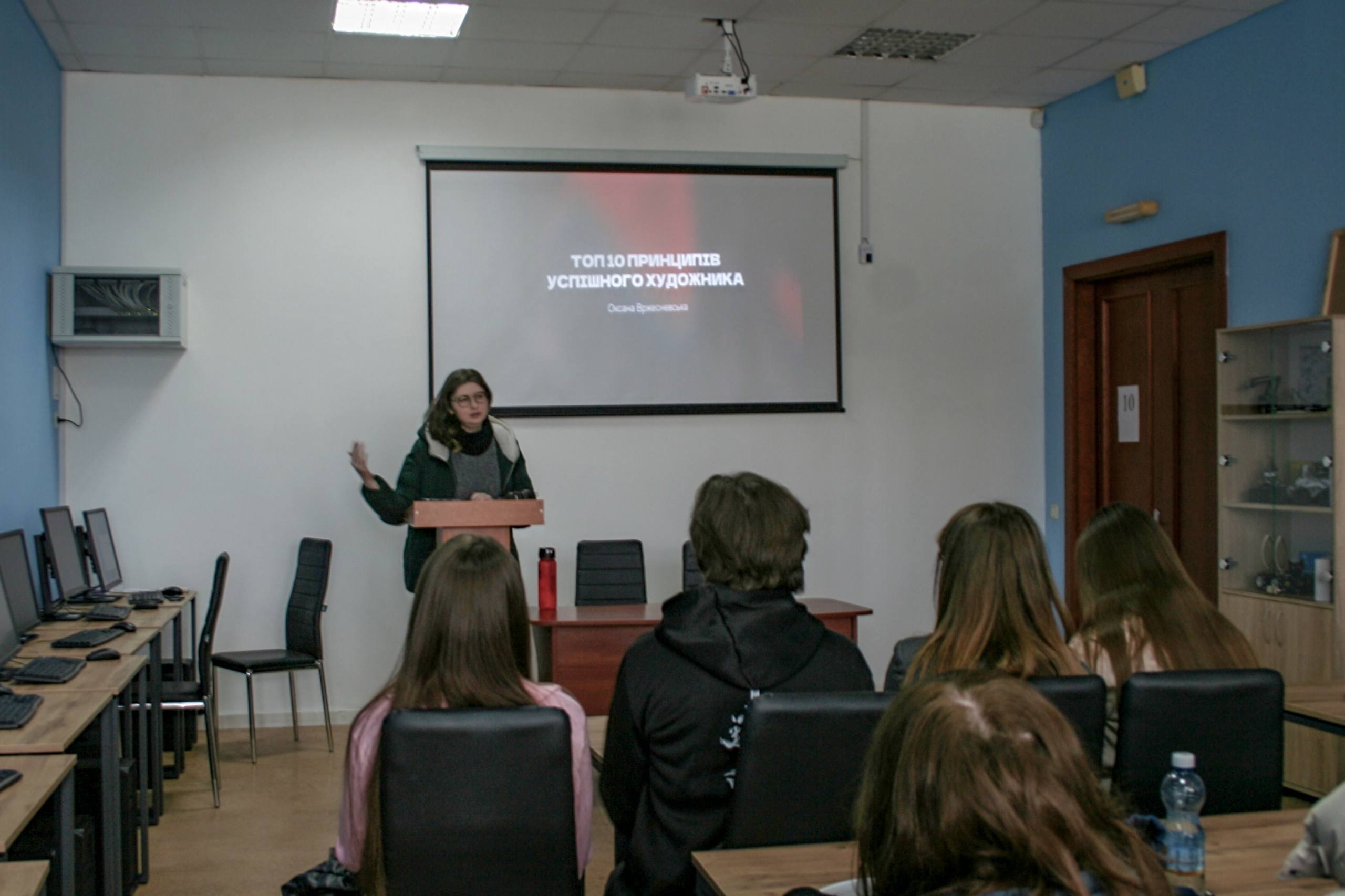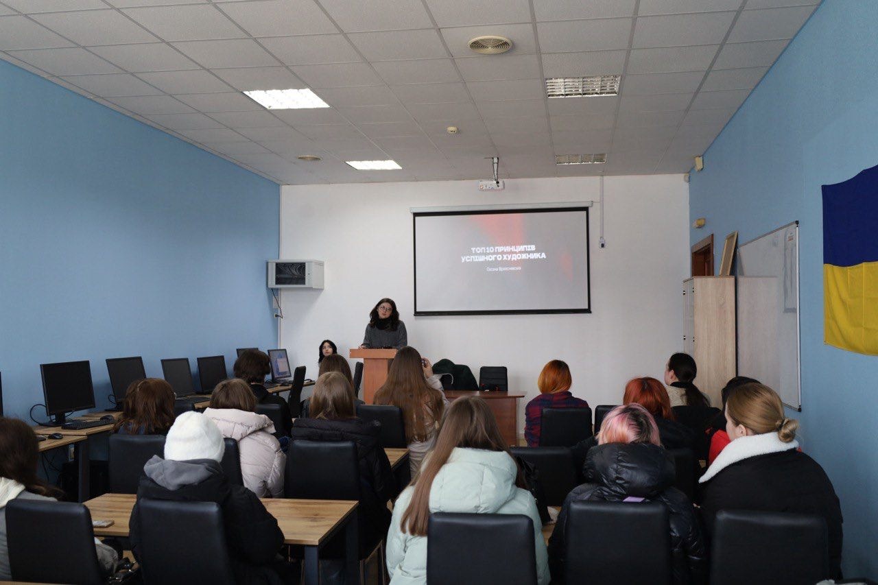 The guest lecturer was artist and illustrator Oksana Vrzhesnevska, who shared her professional experience and practical recommendations for young artists.