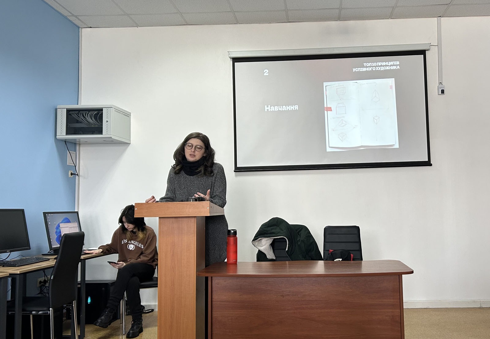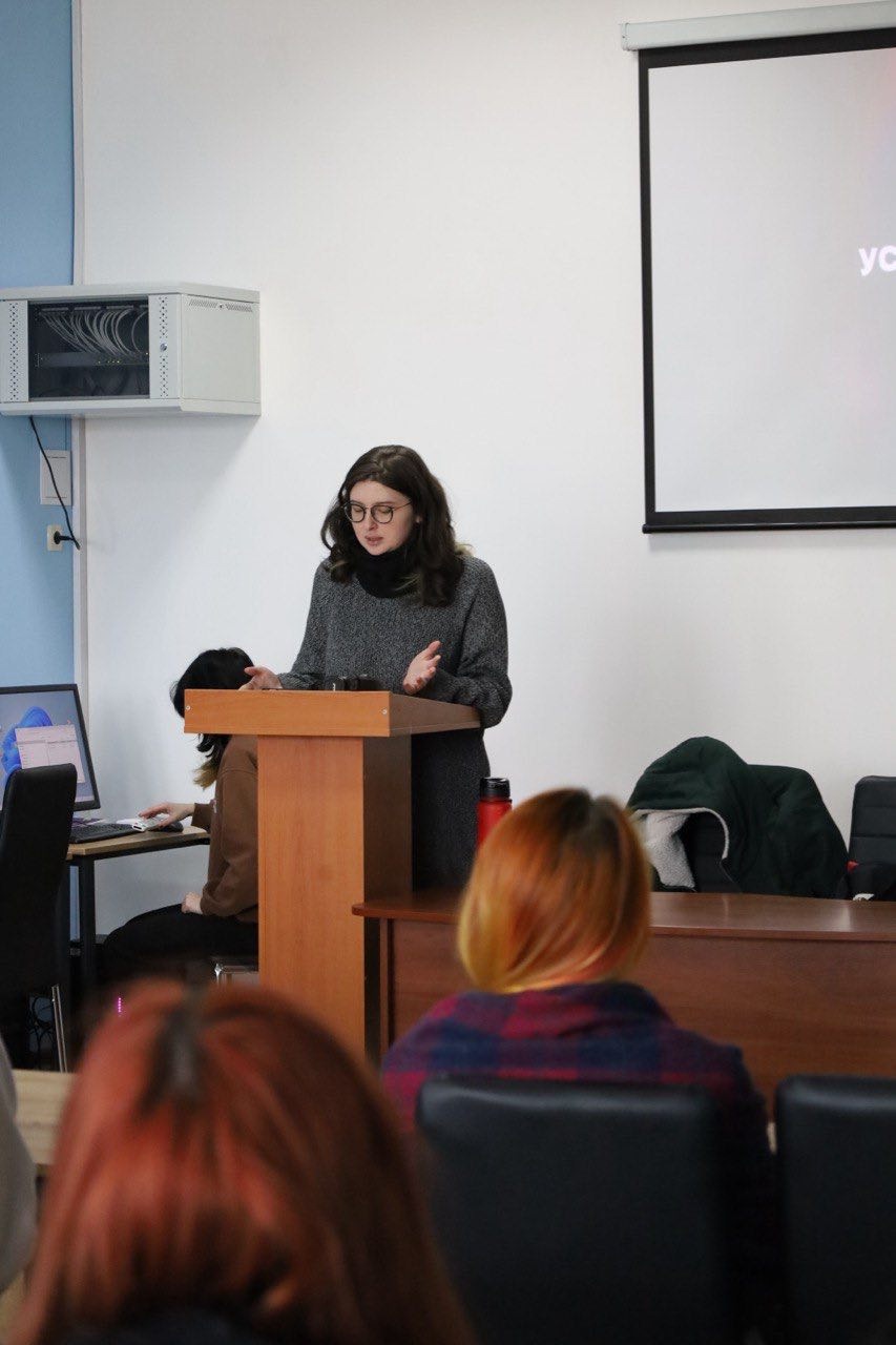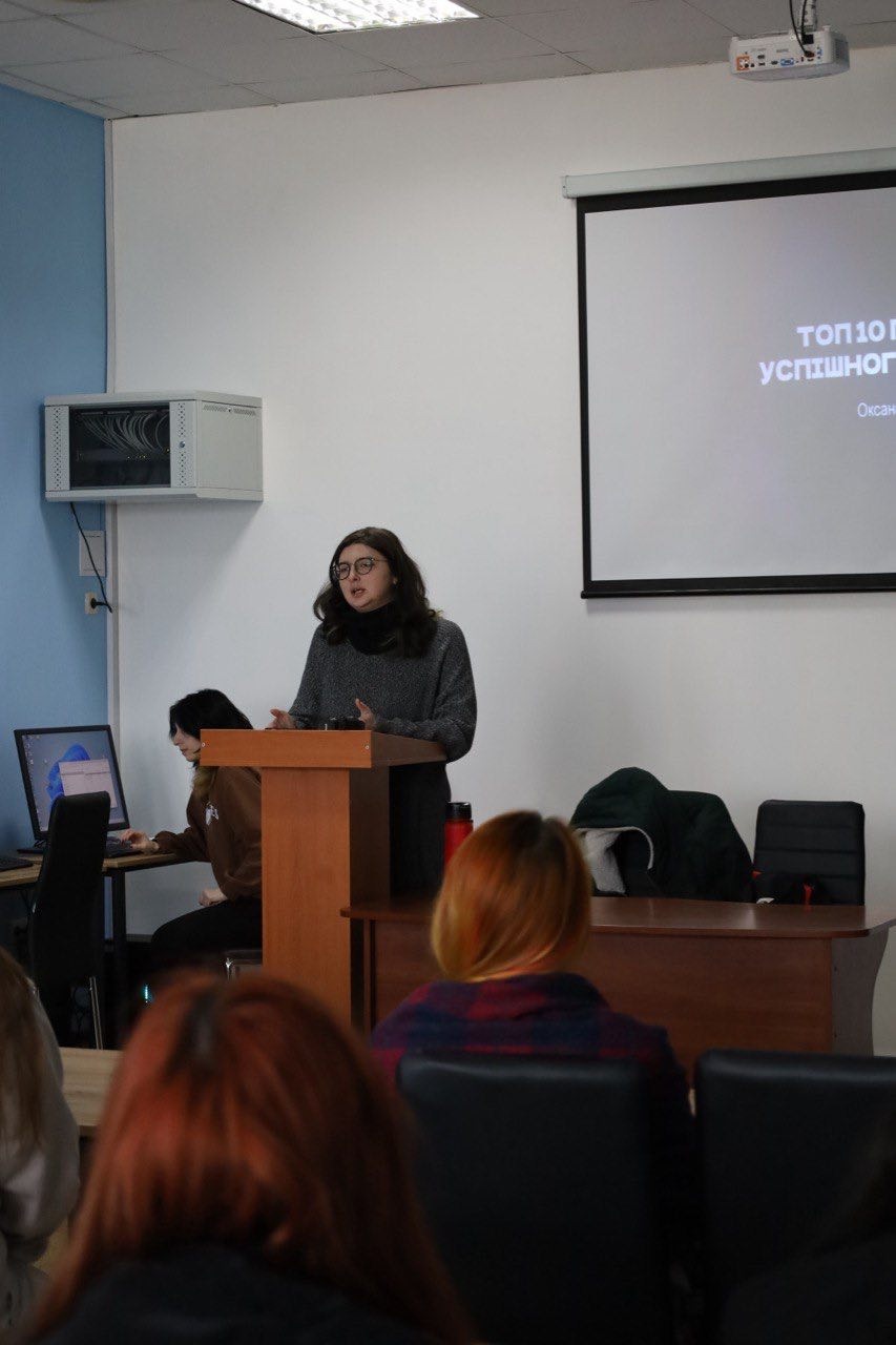 The guest lecturer was artist and illustrator Oksana Vrzhesnevska, who shared her professional experience and practical recommendations for young artists.