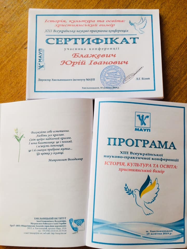 Blazhevych Yuriy Ivanovych, Honorary Local History Specialist of Ukraine. Head of the Khmelnytsky City Organization of the National Union of Local Lore of Ukraine. Candidate of Historical Sciences, Associate Professor