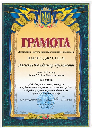 Ratushniak Arsen Yuriyovych (student of the 9th grade of the elementary-educational complex number 10 of Khmelnytsky). For the scientific development of the topic: "International migration as a factor of economic development of Ukraine" and to thank the scientific leader of the methodologist O. Yefimovich.