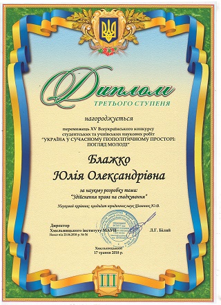 Blazhko Julia (student of the Khmelnytsky Institute of MAUP) for the scientific development of the theme: "Implementation of the right to inheritance" and to express gratitude to the scientific leader of the candidate of legal sciences Tsyganyuk Yu.V.