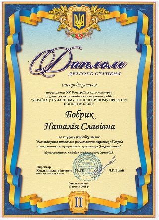 Bobryk Natalia Slavivna (student of Khmelnytskyi Economics and Law College, MAUP) for the scientific development of the topic: "Investigation of the legal regulation of certain objects of the natural environment of Transcarpathia" and to thank the scientific advisor of the candidate of law sciences Ohman O.V.