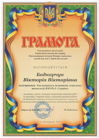 Bodnarchuk Victoria Victoria (student of the Khmelnytsky Institute of Social Technologies, VMURol Ukraine) for the scientific development of the theme: "Features of social psychological work with manifestations of the handicap complex in an inclusive educational environment." Scientific supervisor: candidate of sociological sciences Kovtun O.S.