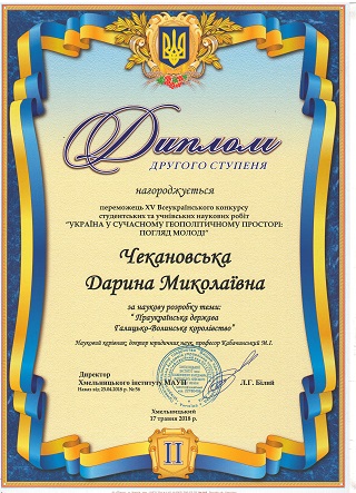 Chekanovsky Darina Nikolaevna. For the scientific development of the theme: "Pro-Ukrainian state Galicia-Volyn kingdom" (cadet of the National Academy of the State Border Guard Service named after B. Khmelnitsky) Scientific supervisor: Doctor of Historical Sciences, professor Kabachinsky MI)
