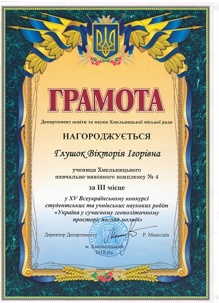 Glushok Viktoriya Igorivna for the scientific development of the theme: "Lyubomyr Huzar - man of the era" (student of Khmelnytsky NSC № 4. Scientific supervisor teacher-methodologist Kovalchuk N.K.)