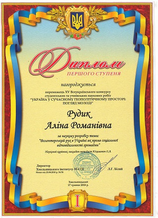 Rudik Alina Romanovna for the scientific development of the theme: "Volunteer Movement in Ukraine as a Manifestation of Social Responsibility of Citizens" (student of Khmelnytsky NSC No. 10. Scientific supervisor teacher-methodologist Efimovich O.A.)