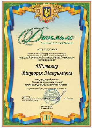 Shuteko Viktoriya Maksimovna (student of Khmelnitskiy NEC №10) for the scientific development of the topic: "History and prospects of development of KNOWLEDGEBASED ECONOMY in Ukraine" and to thank the scientific leader of the methodologist Efimovich O.A.