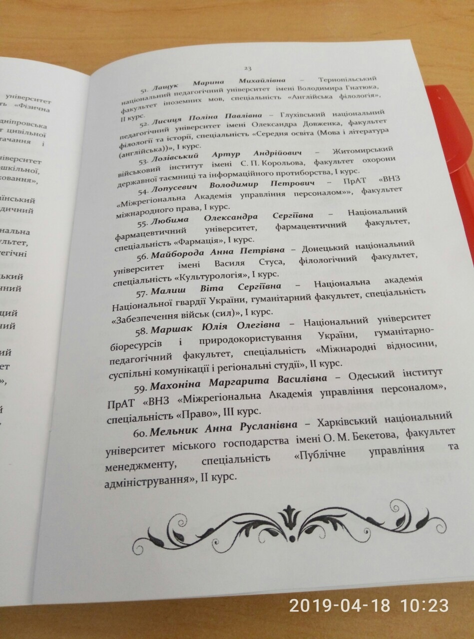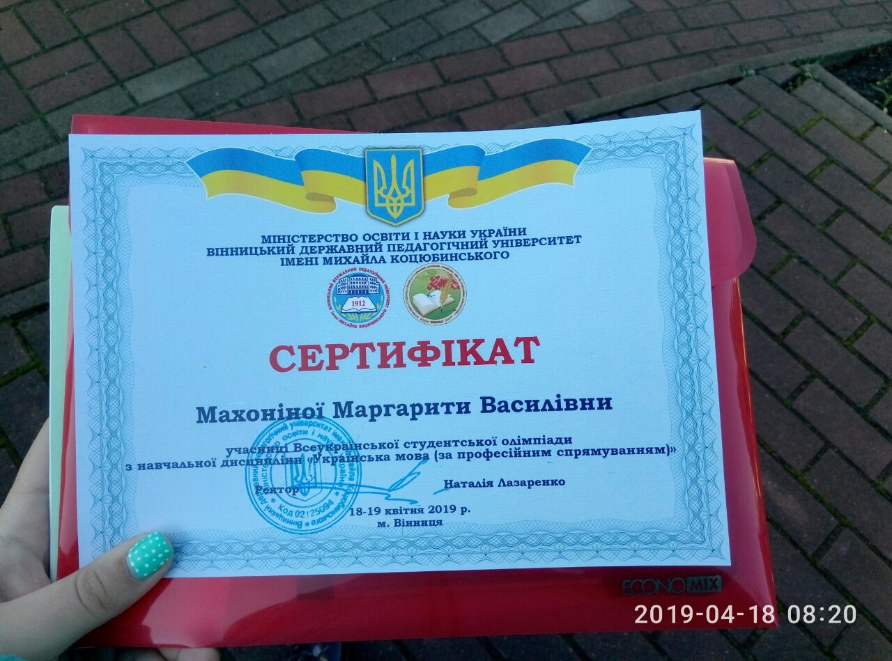 - Margarita Mahonina - at the Olympiad on the Ukrainian language in a professional direction at the Vinnytsia State Pedagogical University named after M. Kotsyubinsky and received the Certificate of the participant of the II stage;