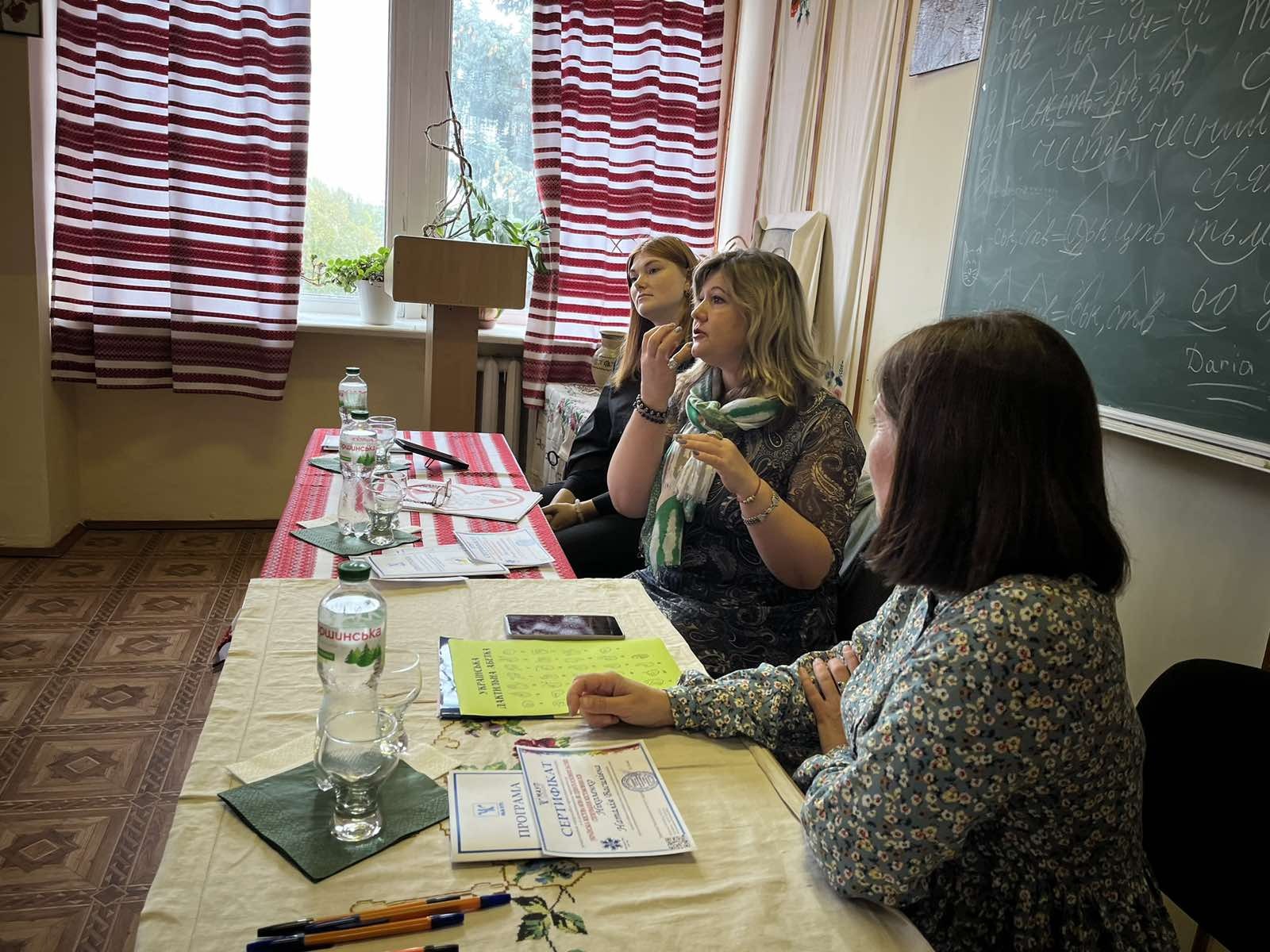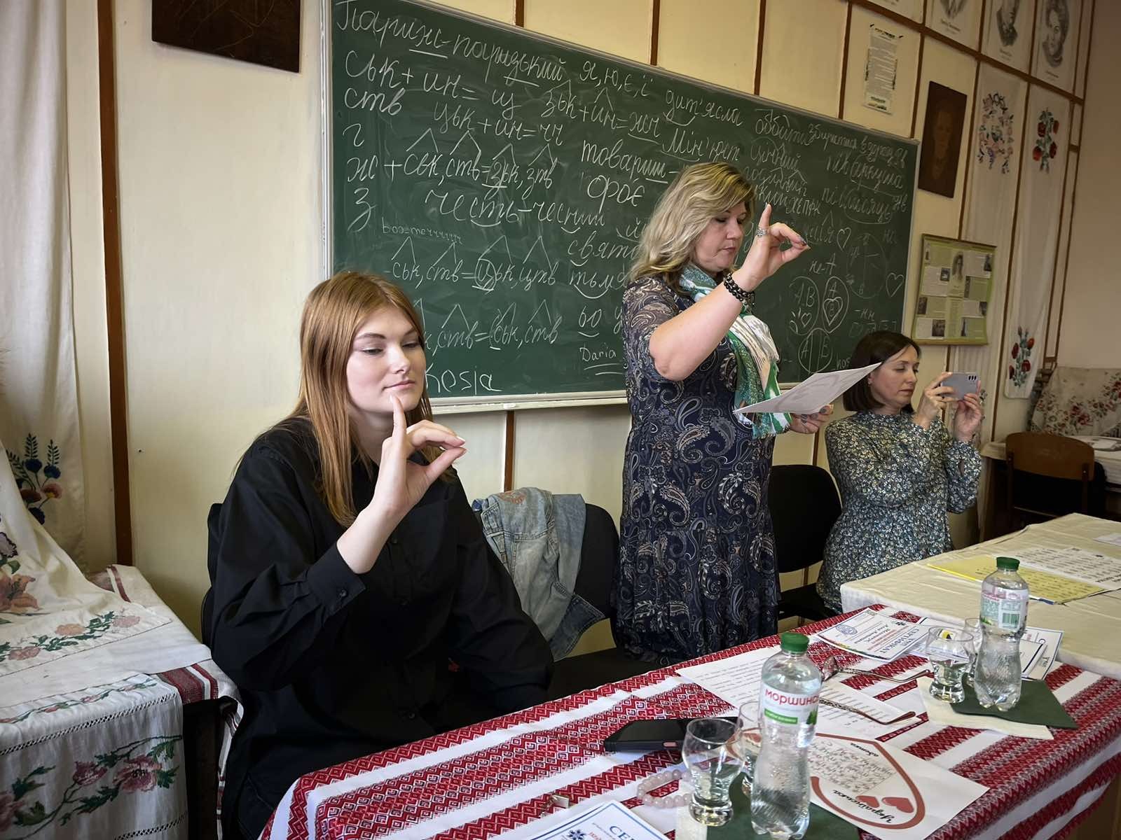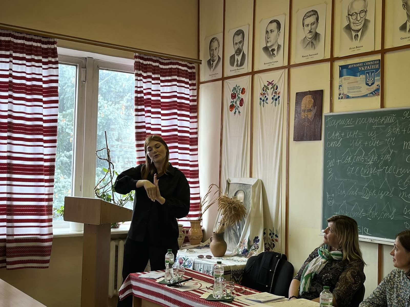 The speakers were: Natalia Nikolenko, Chair of the Khmelnytsky Regional Organization of the Ukrainian Society of the Deaf; Alla Melnychuk, psychologist at Khmelnytsky Special General Education School No. 33; Maria Yaremchuk, lecturer at the Department of Psychology of the Khmelnytsky Institute of the Interregional Academy of Personnel Management; beneficiary of the Khmelnytsky Regional Organization of the Ukrainian Society of the Deaf. They shared their many years of experience working with sign language users, spoke in detail about the importance of sign language in the daily lives of people with hearing impairments, and demonstrated basic communication techniques.