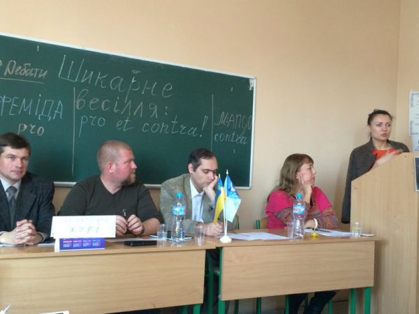 The current scientific debate began with performances of club leaders. Deputy Head of the Law Department, Senior lecturer in law, Scientific Director of the Club "Themis", Associate Professor Zolotareva O.A. told about the peculiarities of Ukrainian traditional wedding, and reminded the rules of the debate. Problems of organization of the modern wedding was analyzed by PhD in Economics, Senior Lecturer, Department of Economics and Management, Scientific Director of the Club "M: Ango" Moroz D.G. Team members were presented - 5 students (3-5 courses) of each club. An independent jury - Volyansky Vadim - Chairman of the jury, Doctor of Political Sciences, Deputy Director of the IAPM Olympiad, scientific director of "Aсademia 'Club; Bogan Sergei - Candidate of Historical Sciences, Head of the department of Psychology and Scientific disciplines; Father Alexander (Alexander Filippov) - senior lecturer in psychology and scientific disciplines, a psychologist, a famous volunteer, priest of the institute chapel.