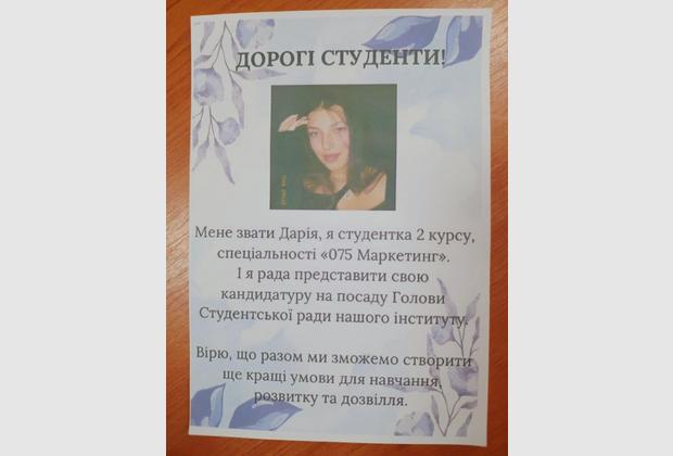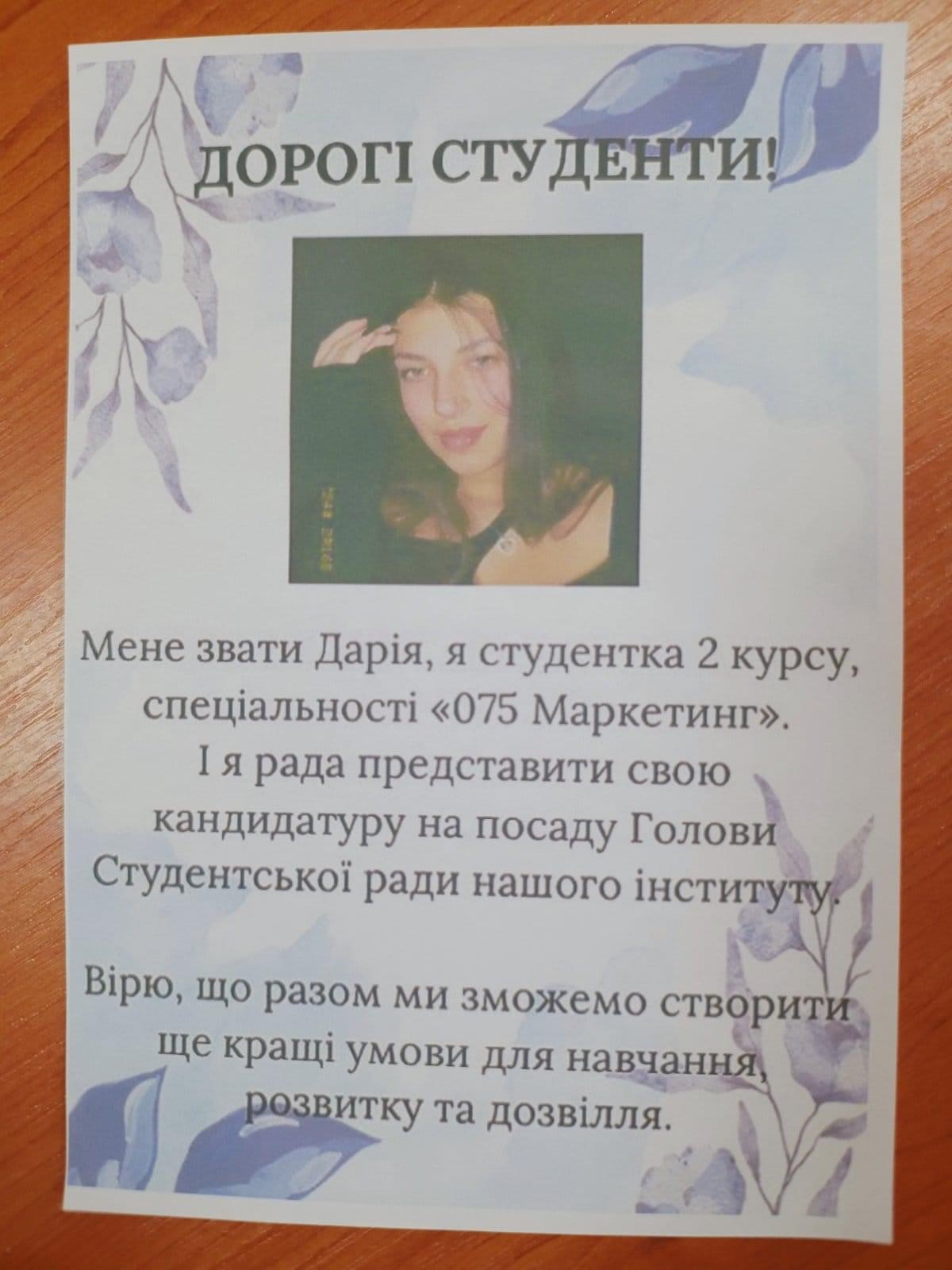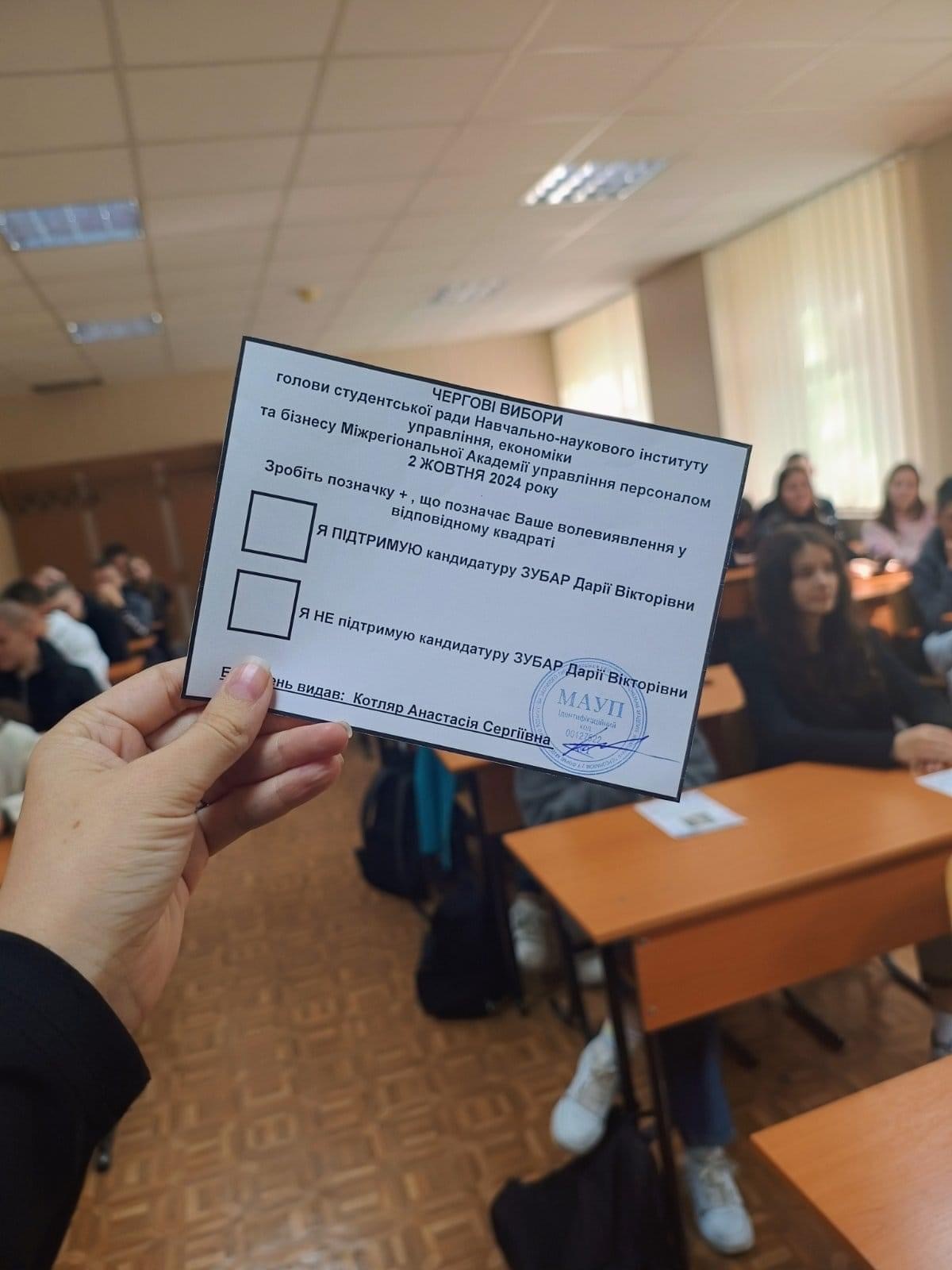 On October 2, the elections for the chairman of the student council of the Educational and Scientific Institute of Management, Economics and Business of the IAPM were held. Students listened to the program of the candidate for the position of chairman and took part in the vote. During the vote, Zubar Daria, a 2nd year student of the institute, was elected chairman of the student council! We congratulate Daria on her victory and on a new stage in her life! We expect interesting ideas and a promising action plan from the new composition of the student council for the development of student self-government at the institute.