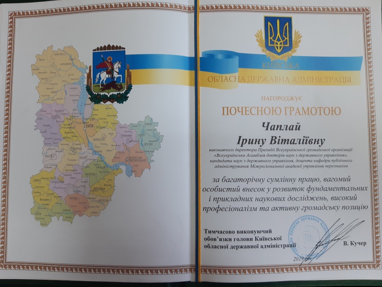 The head of the department of vocational education and management of the educational institution of the IAPM Iryna Vitaliyivna Zhukova was awarded the honorary certificate of the Kiev regional state administration for many years of diligent work, a significant personal contribution to the development of fundamental and applied scientific research, high professionalism and active public position.
