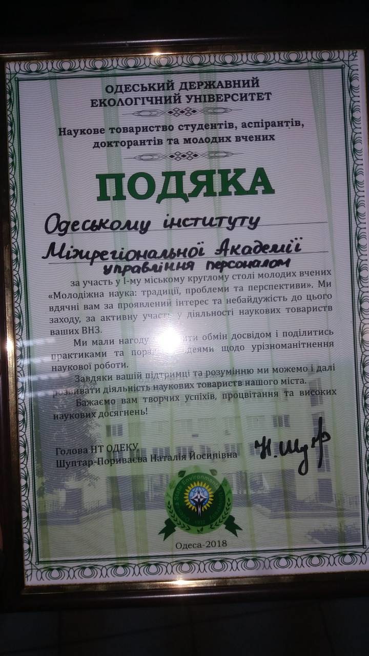 December 19, 2018, a meeting of the First сity roundtable discussion of young scientists of Odessa "Youth Science: Traditions, Problems and Prospects" was held at the premises of student's coworking of the Odessa State Ecological University, which was attended by the Board of IAPM Odessa Institute in the person of Arseniy Gavrilyuk, presenting their activities. Participants of the event exchanged experience of their scientific societies, discussed problems in scientific and other creative activities in the youth environment and possible ways of overcoming them, shared their work on improving the efficiency of the work of scientific societies in universities, for which IAPM Odessa Institute received gratitude from the organizers of the project for the expressed interest in the event and has the hope that the coming 2019 will bring productive results of the interaction of the young scientists of our city who have become participants of the roundtable discussion!