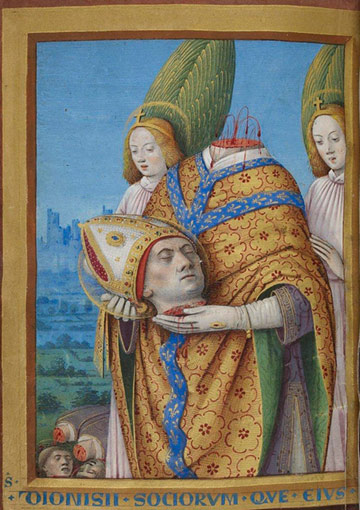 Багато богословів, істориків і церковних діячів Середньовіччя свідчили про те, що святий Діонісій проповідував Євангеліє і на території нинішньої Франції і був першим єпископом Парижа, де за сповідання християнської віри він прийняв мученицьку смерть на Монмарті, коли язичники усікли його голову мечем. З церковного життєпису відомо, що святий Діонісій взяв свою голову, пройшов з нею до храму і лише тоді там впав мертвий, а потім благочестива жінка Катула поховала останки святого мученика. І саме тому в середньовічному живописі, архітектурі та іконографії Християнської Церкви (православ’я, католицизм) святий зображується у вигляді єпископа із відсіченою головою. Сьогодні на Святій Горі Афон у монастирі Григоріат є частина глави священномученика Діонісія Ареопагіта.