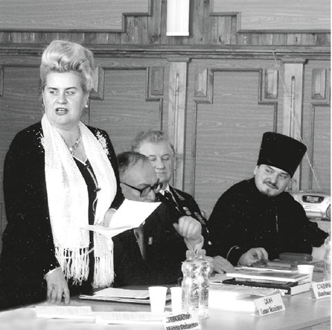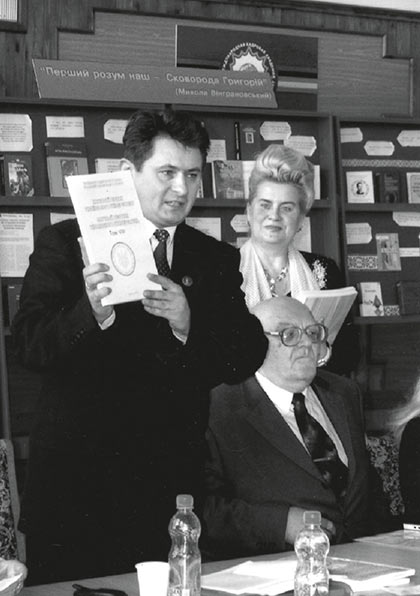 Професор Ідзьо В. С.; видатний український філософ, культуролог, академік Кримський С. Б.; професор Сагач Г. М. на конференції «Ідемо за Сковородою» в МАУП (фото з архіву Центру риторики «Златоуст»)