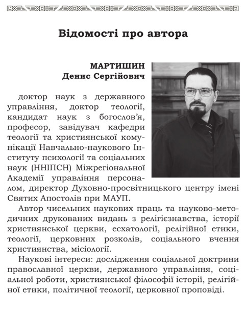 Переконані, що діалог публічного управління і соціального вчення християнської церкви лише зміцнить партнерські державно-конфесійні відносини в Україні, оскільки потенціал християнської теології у справі духовно-морального оздоровлення українського суспільства, осмислення політичної діяльності, процесів державотворення, ідей демократії, свободи слова, віросповідання, реалізації фундаментальних прав людини, захисті суспільної моралі, втілення ідеалів гуманізму ще не до кінця використані. І саме тому сподіваємося, що книга професора Дениса Мартишина «Публічне управління і християнська теологія: сучасний стан і перспективи» буде корисною для посадових осіб органів державної та місцевої влади, релігійних та громадських діячів, журналістів, а також для науковців, викладачів, студентів світських і духовних навчальних закладів, які вивчають історію християнської церкви, релігієзнавство, теологію, політологію, філософію, соціологію та інші галузі суспільних і гуманітарних наук.