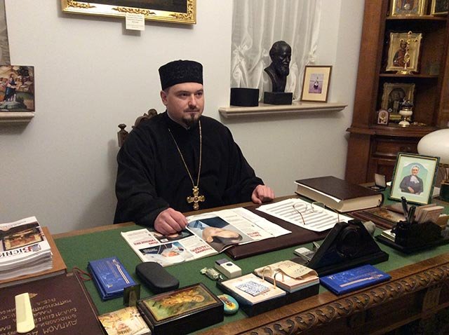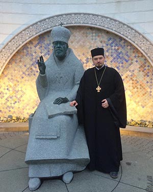 Протоієрей Діонісій Мартишин біля пам’ятника Блаженнішому Митрополиту Київському і всієї України Володимиру (Сабодану), Предстоятелю Української Православної Церкви (Музей пам’яті Блаженнішого Митрополита Володимира) |