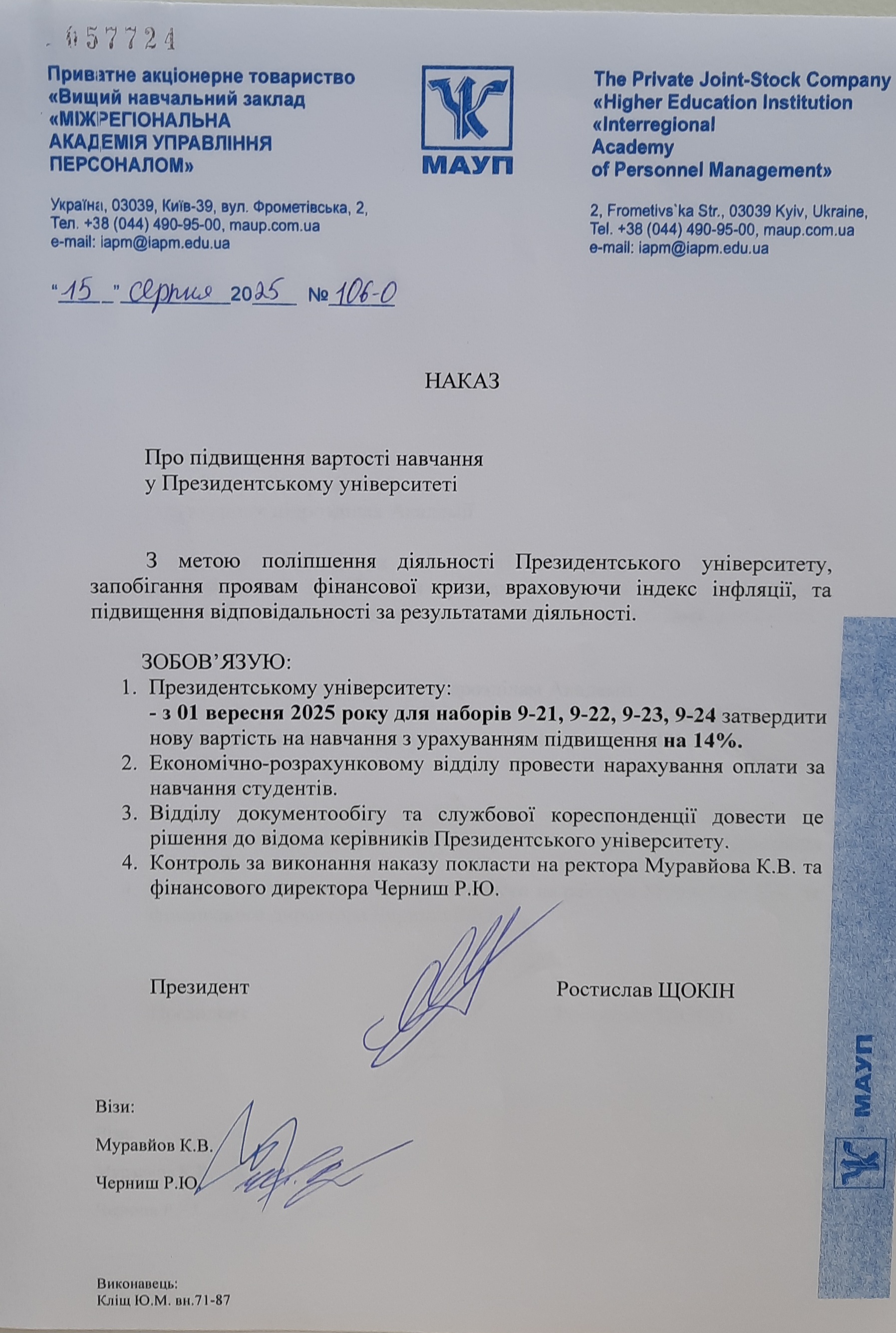 Наказ №106-0 від 15.08.25 "Про підвищення вартості навчання у Президентському університеті"