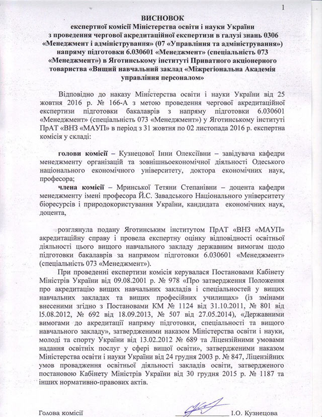 Висновок експерної комісії МОН України з проведення чергової акредитаційної експертизи в газузі знань 0306 "Менеджмент і адміністрування"