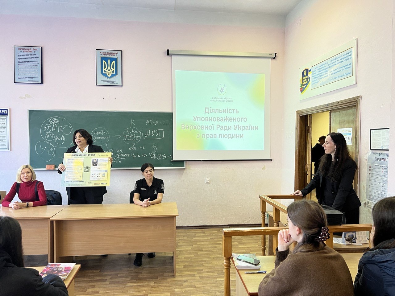 Фахівці регіонального представництва Уповноваженого у Хмельницькій області Оксана Шейгец та Ольга Осередчук спільно з начальником сектору дотримання прав людини Хмельницького районного управління поліції, майором поліції Людмилою Берестовською провели захід для студентів-правників Хмельницького інституту МАУП, під час якого розповіли молоді про діяльність Уповноваженого Верховної Ради України з прав людини, особливості діяльності з дотримання прав людини в діяльності правоохоронних органів.