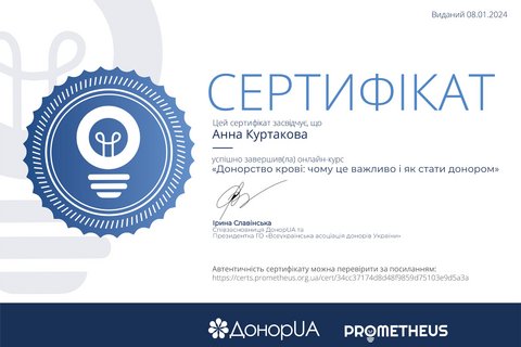 Начальник відділу організації практики та позанавчальної роботи Куртакова А.О. пройшла курс "Донорство крові: чому це важливо і як стати донором"