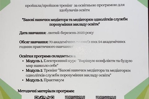 Студент Навчально-наукового інституту психології та соціальних наук пройшов тренінг за освітньою програмою для здобувачів освіти “Базові навчики медіатора та медіаторки однолітків служби порозуміння закладу освіти”