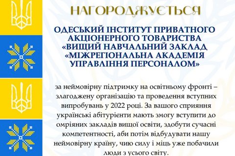 Одеський інститут МАУП отримав грамоту від УЦОЯО та ОРЦОЯО