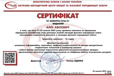 Участь Хмельницького фахового коледжу МАУП у програмі підвищення кваліфікації голів циклових комісій «Інноваційна педагогічна діяльність в закладах фахової передвищої освіти»