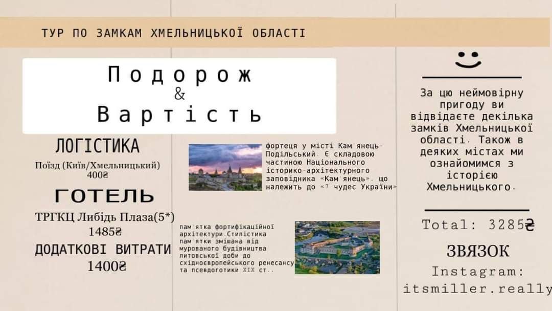 Під керівництвом завідувача кафедри д.і.н., проф. Лукашенко Аліси Іванівни студенти підготували авторські тури за заданими критеріями, креативно комбінуючи елементи туристичних атракцій Хмельницької області. Крім того, студенти отримали навички реклами свого продукту.