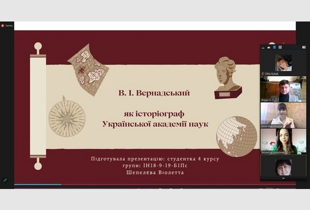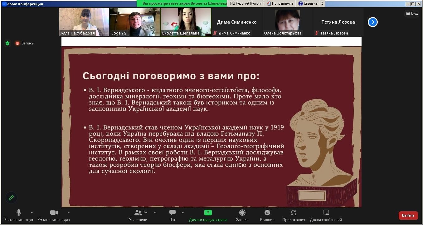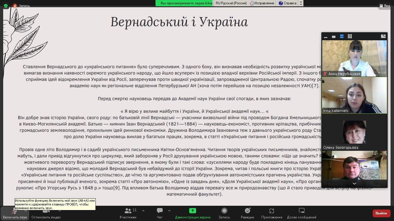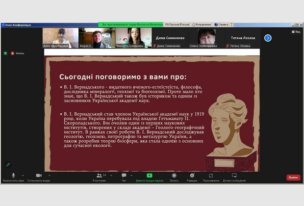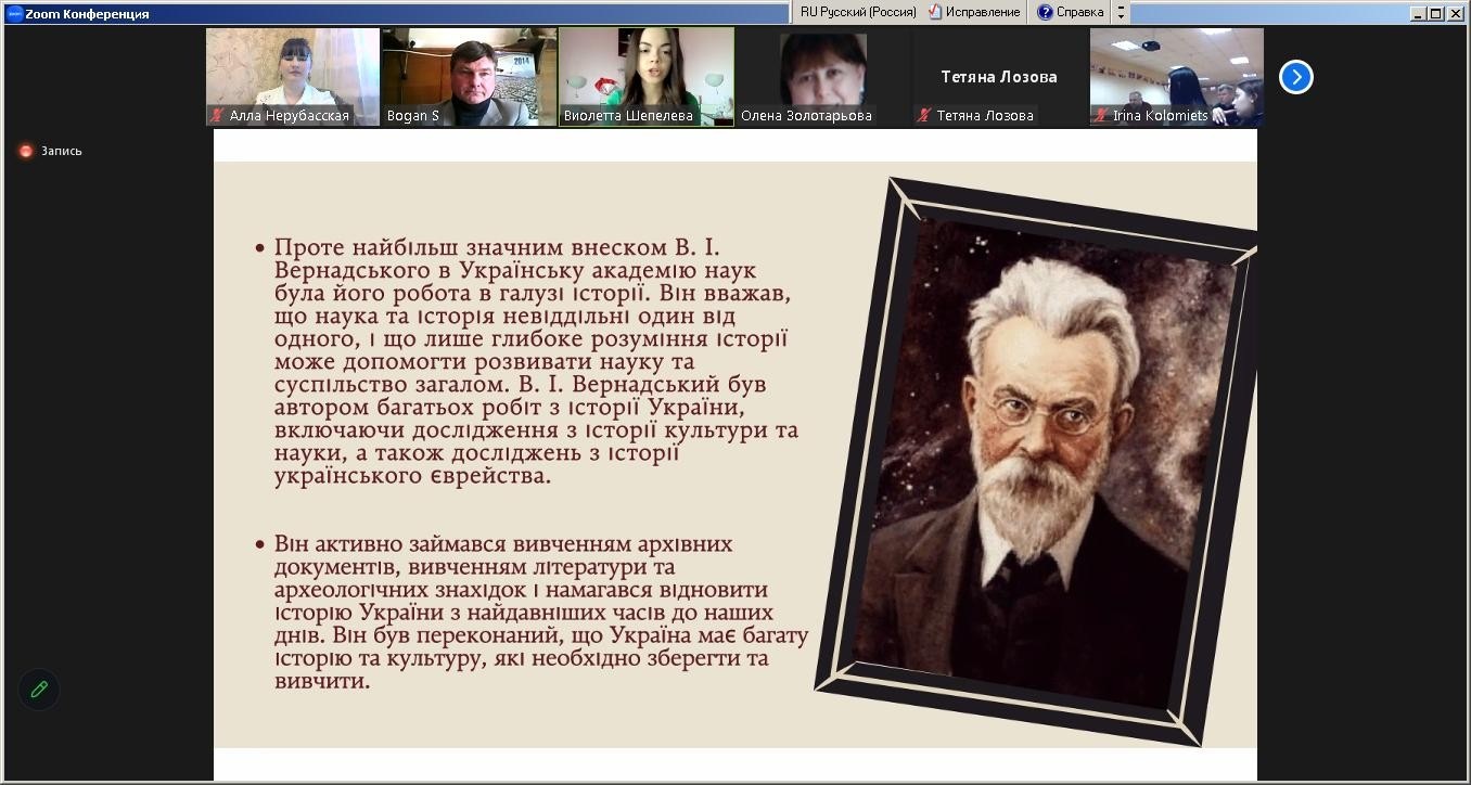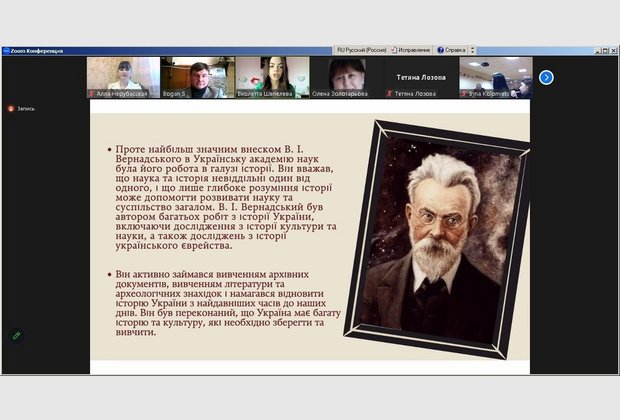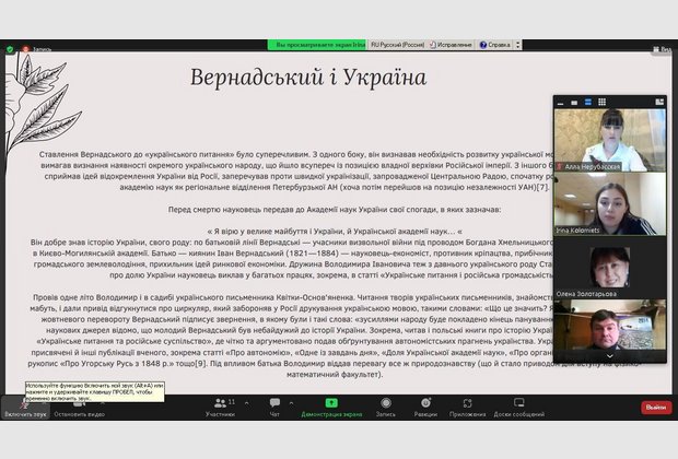 Психологічний портрет особистості Володимира Вернадського охарактеризувала доктор філософських наук, доцент, завідувач кафедри загальнонаукових, соціальних та поведінкових дисциплін Алла Нерубасська. З доповіддю про створення Української академії наук на чолі з В.Вернадським за правління гетьмана Павла Скоропадського виступив к.і.н., доцент кафедри правових дисциплін Сергій Боган. З дискусійною темою "Українська складова ідей євразійства" ознайомила учасників заходу к.філол.н., доцент кафедри загальнонаукових, соціальних та поведінкових дисциплін Ніна Сапригіна. Члени студентського наукового Клубу "Психолог" Діана Лукашова, Віолетта Шепелєва, Єлизавета Шелепун і Аліна Паладе доповіли про творчий спадок академіка в дослідженні космології, біосфери, історії, історіографії, наукової діяльності В.Вернадського в Україні: Одесі, Києві та Криму.