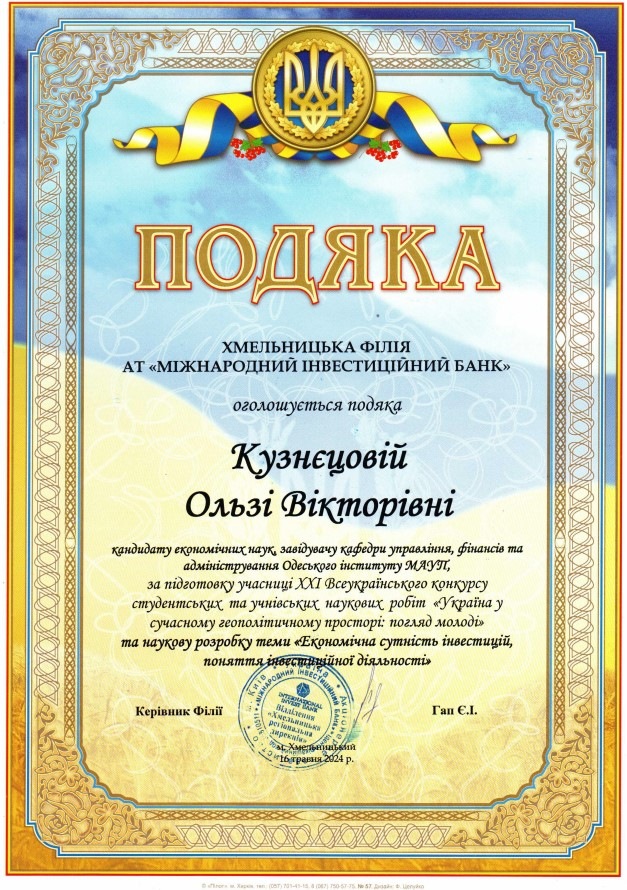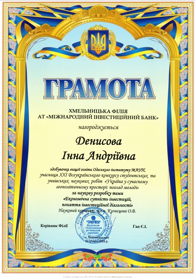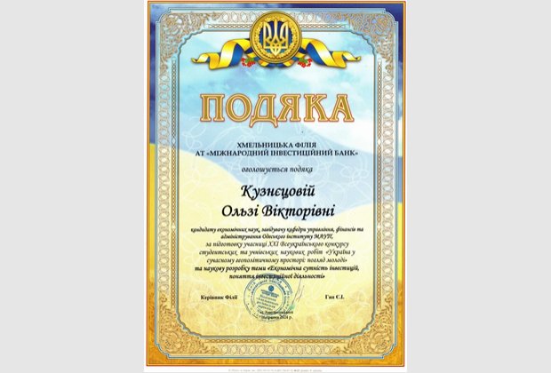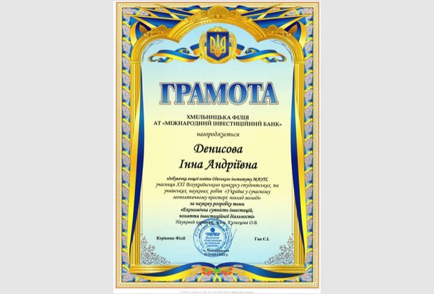 Денисову Інну – студентку 4 курсу спеціальність Менеджмент нагороджено Грамотою від Хмельницької філії АТ «Міжнародний інвестиційний банк» за наукову розробку теми: «Економічна сутність інвестицій, поняття інвестиційної діяльності»; науковий керівник: к.е.н., доцент кафедри Кузнєцова О.В. отримала Подяку за підготовку учасника.